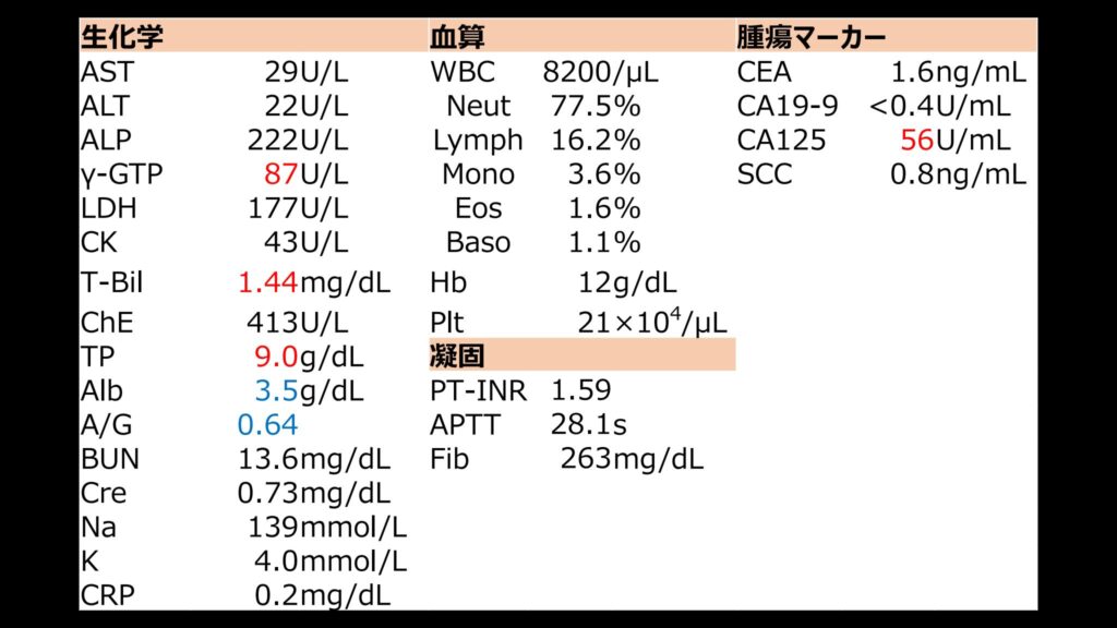 | 既往歴 | 5年前より原因不明の肝障害が持続しているとのこと 他、特記すべき既往なし |