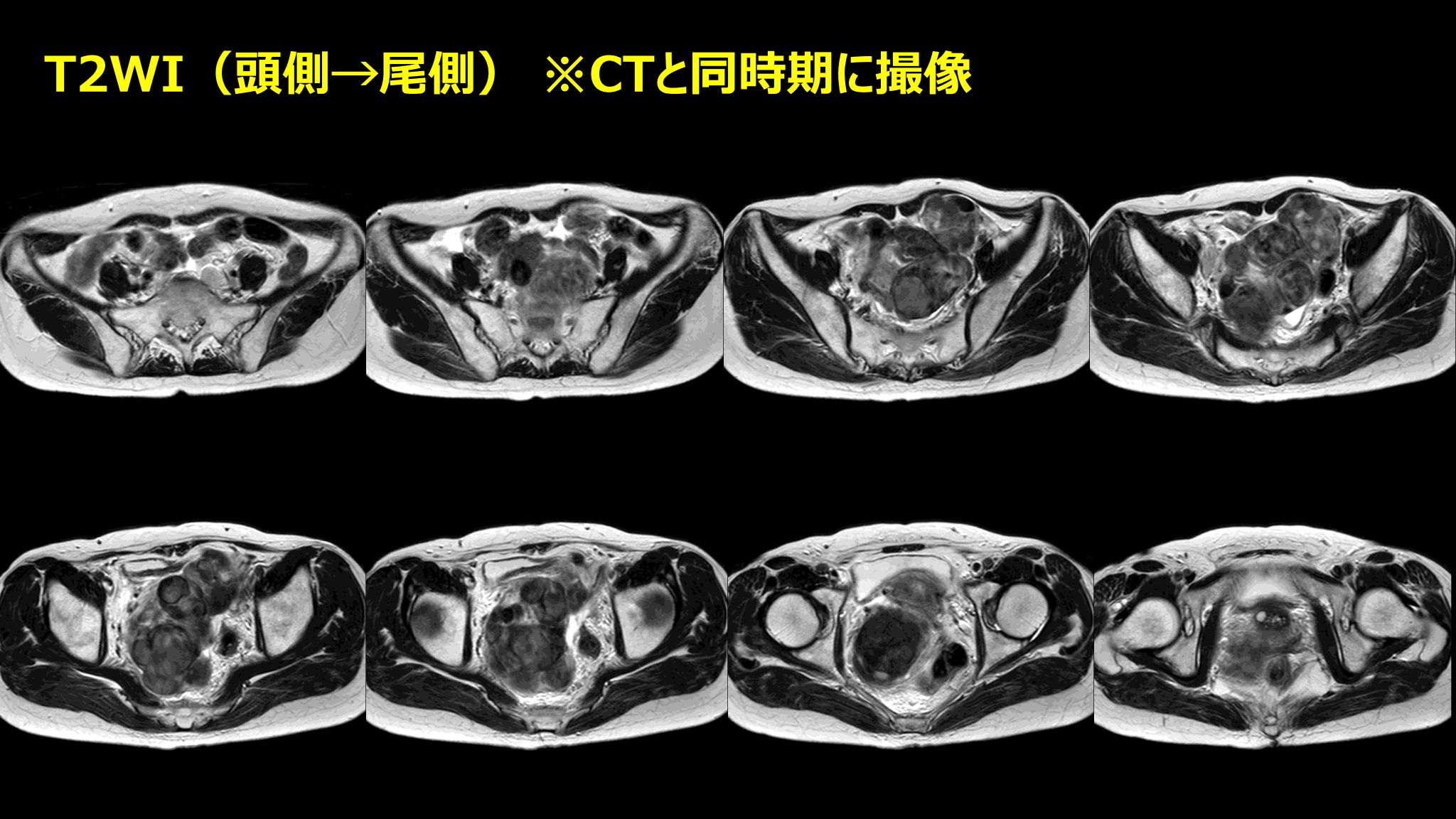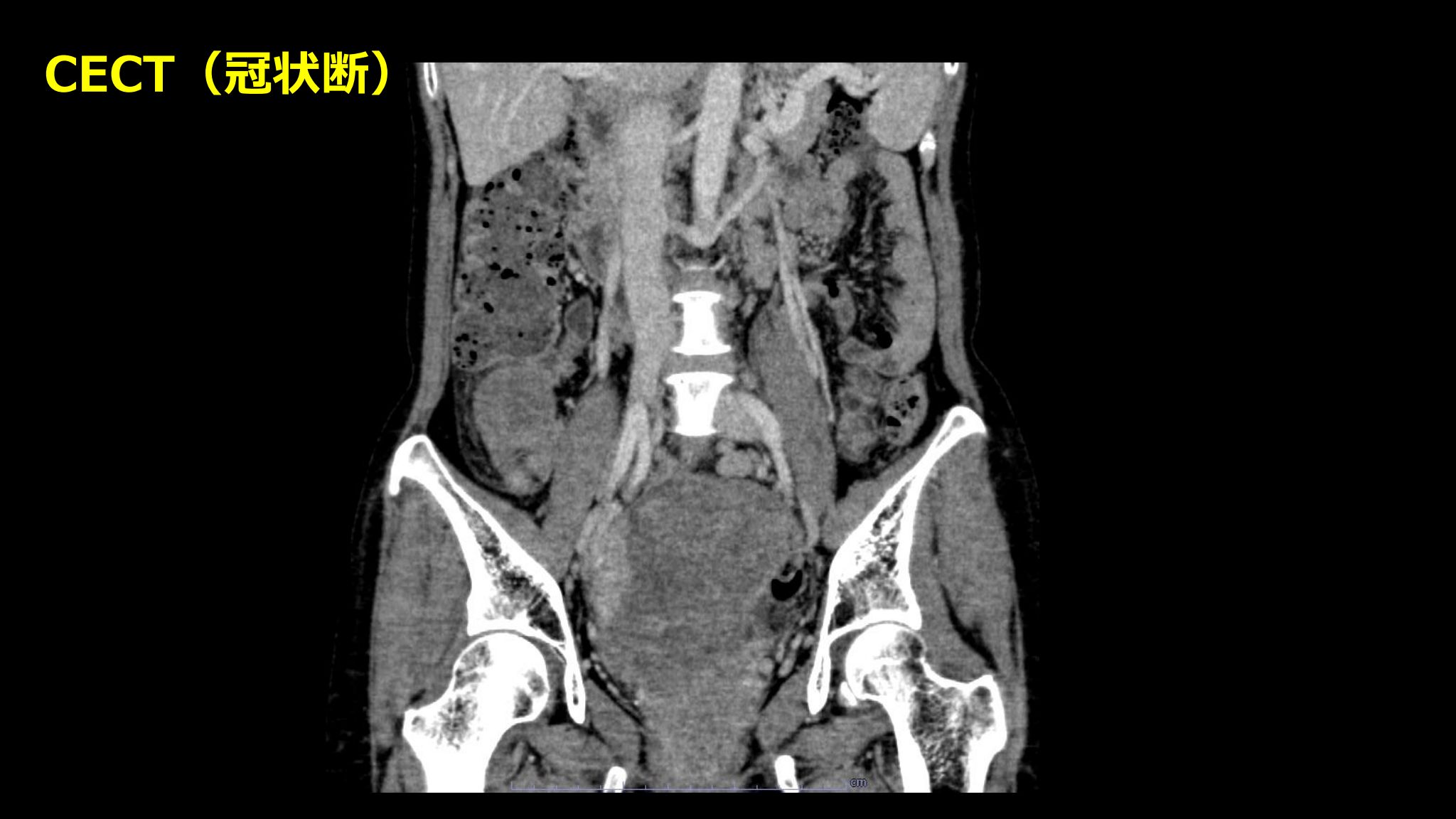 | 補足情報 | 骨盤部の最大の病変は両側卵巣腫瘤であった 術前の上下部内視鏡検査では消化器系の悪性腫瘍を指摘できなかった 膀胱頸部側の病変疑いについても膀胱鏡が施行されたが、 異常を指摘できなかった(今回の病態との関連は不明) |