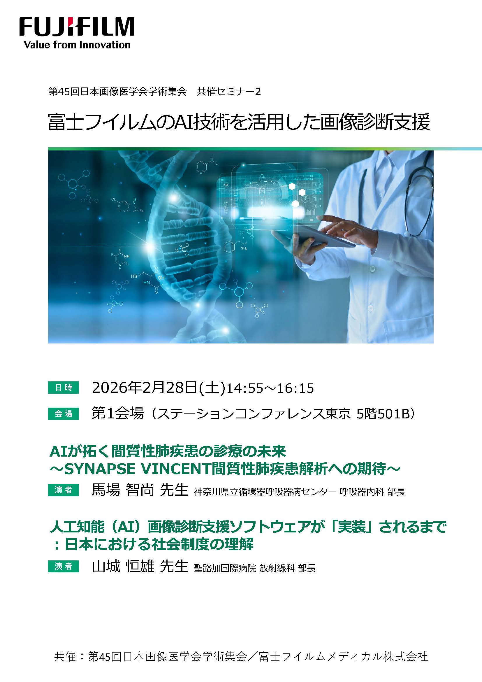 ■共催セミナー 人工知能 KY02 共催セミナー2 富士フイルムのAI技術を活用した画像診断支援(共催/富士フイルムメディカル株式会社) 2026年2月28日14:55~16:15第1会場 KY02 共催セミナー2富士フイルムのAI技術を活用した画像診断支援 講師 1)AIが拓く間質性肺疾患の診療の未来 ?SYNAPSE VINCENT間質性肺疾患解析への期待? 馬場 智尚 (神奈川県立循環器呼吸器病センター呼吸器内科) 2)人工知能(AI)画像診断支援ソフトウェアが「実装」されるまで:日本における社会制度の理解 山城 恒雄 (聖路加国際大学聖路加国際病院放射線科) 参加者・会員限定エリアです パスワードをご入力ください Enter your password Unlock