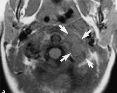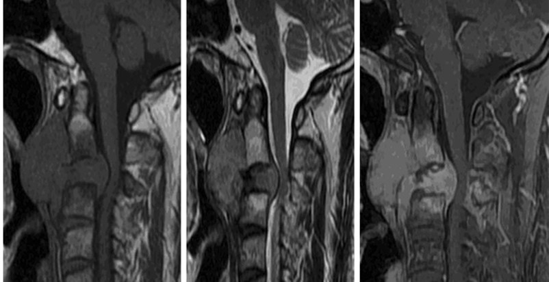 - MRIにて、腫瘤はT1WI、T2WIにて筋肉よりやや高い信号で、内部に液状のT2WI高信号を認めるが、その他の信号は比較的均一で、内部を椎骨動脈が走行する。ヘモジデリン沈着や石灰化を疑う低信号域は見られない。
