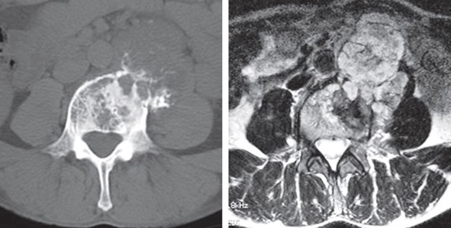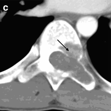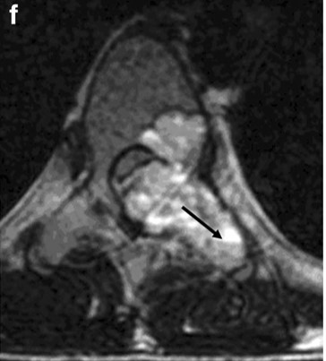 - 椎弓や脊柱管内、周囲軟部組織に及ぶ事が多い。