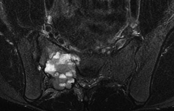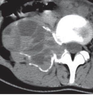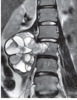 - MRI: T1WI 低-等信号、T2WI 不均一な低-等、時に多房性嚢胞性変化や液面形成を伴う。