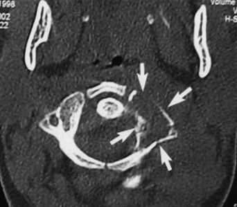 - CTにて辺縁に硬化縁を伴う。歯突起に病的骨折あり。