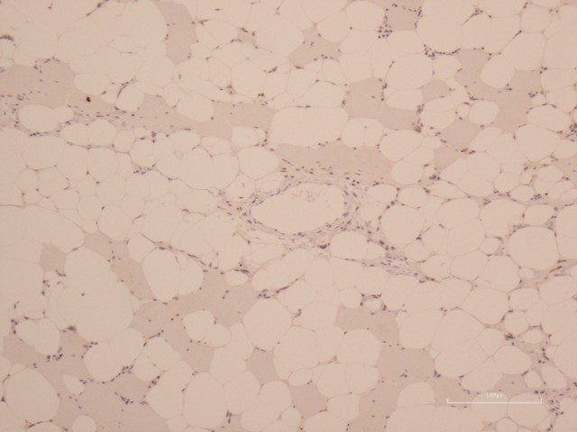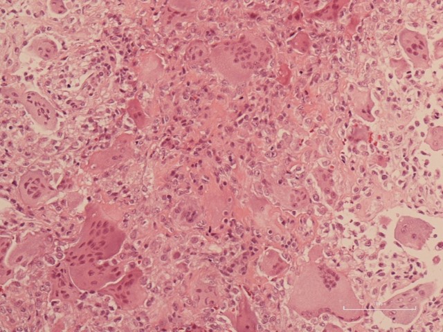 HE染色にて、多核巨細胞を多数認め、周囲に紡錘状細胞を伴う。核異型には乏しいが、一部類骨のようにも見えるため、骨肉腫との鑑別が問題となる。