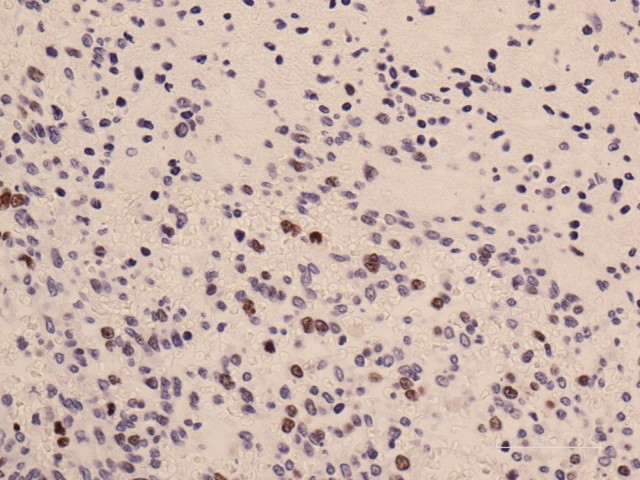 PCL病理細胞診センター中嶋安彬先生にコンサルテーションを行い、追加で免疫染色を施行。MIB-1陽性率は15%と高めではあるが、cdk4は陰性であり、骨巨細胞腫の診断となる。