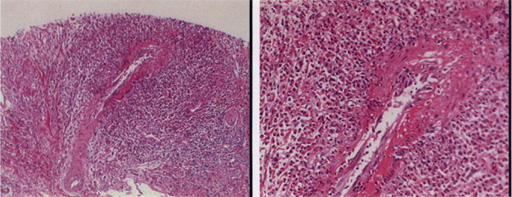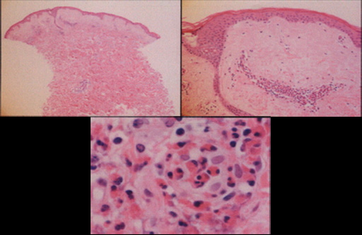 真皮浅層の血管内には好中球、好酸球が充満し、血管壁にも好中球・好酸球の浸潤が見られる。血管周囲に浸潤する炎症性細胞は好酸球であり、脱顆粒している(下)。