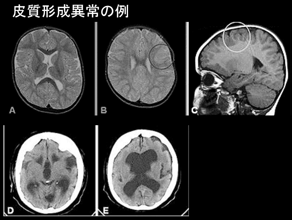 Cerebral imaging in patient 1 (A–C) and patient 2 (D, E). Panels A–C show axial, T2 weighted (A, B) and sagittal, T1 weighted (C) MR images with deficient gyration of the frontal lobes and an area suspected of being cortical dysplasia in patient 1 (circles in panels B and C). Panels D and E show CT images from patient 2, with enlarged ventricles, wide opercular regions, and clear signs of frontal lobe cortical malformation with an abnormal flat cortex with only a few, simple and shallow sulci.