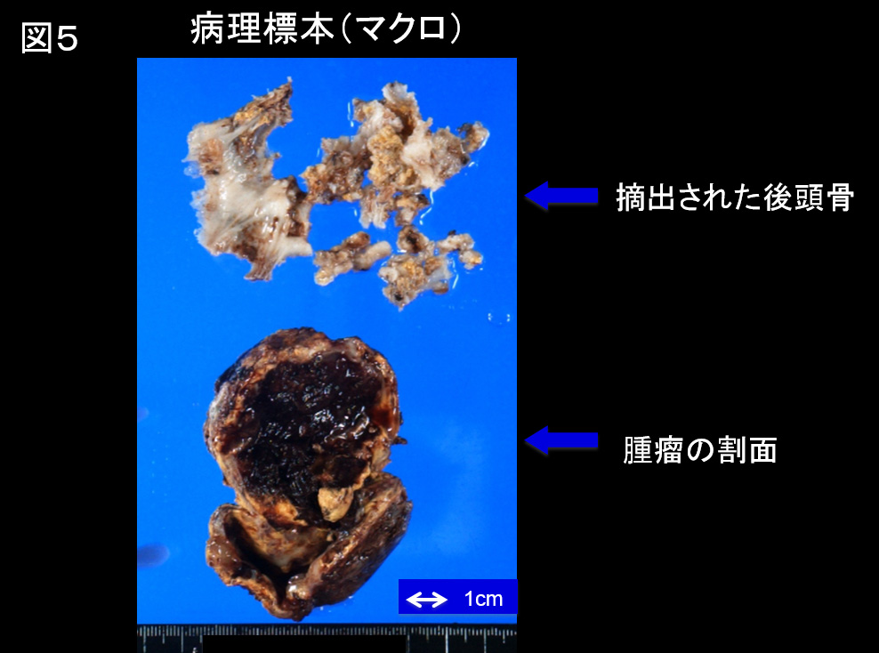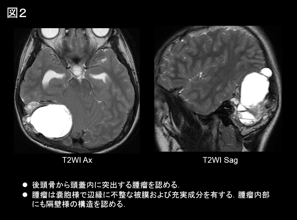 - 後頭骨から頭蓋内に突出する腫瘤を認める.