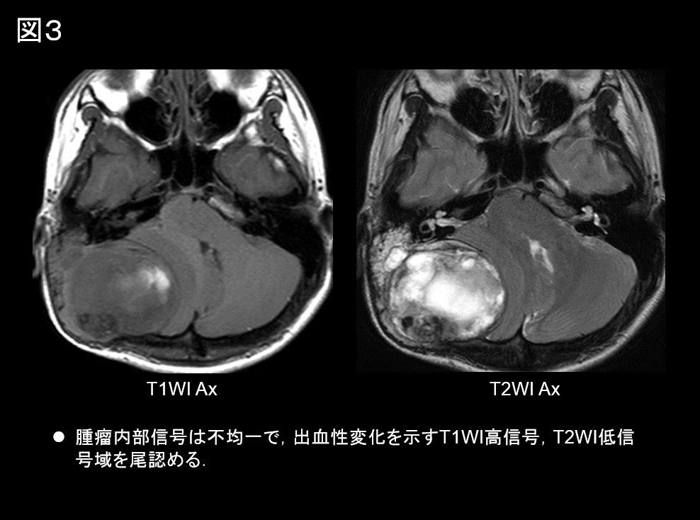 - 腫瘤内部信号は不均一で,出血性変化を示すT1WI高信号,T2WI低信号域を認める(図3)。