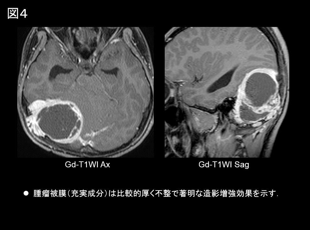 - 腫瘤被膜(充実成分)は比較的厚く不整で著明な造影増強効果を示す(図4)