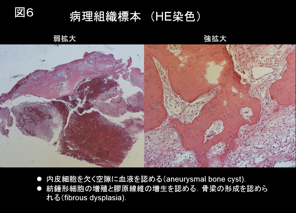 - 内皮細胞を欠く空隙に多量の血液がみとめられ,aneurysmal bone cystが示唆される(図6)。