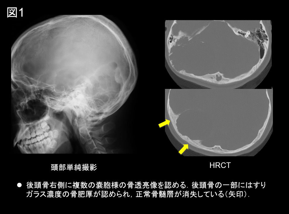 後頭骨の一部にはすりガラス濃度の骨肥厚が認められ,正常骨髄層が消失している。(図1矢印)