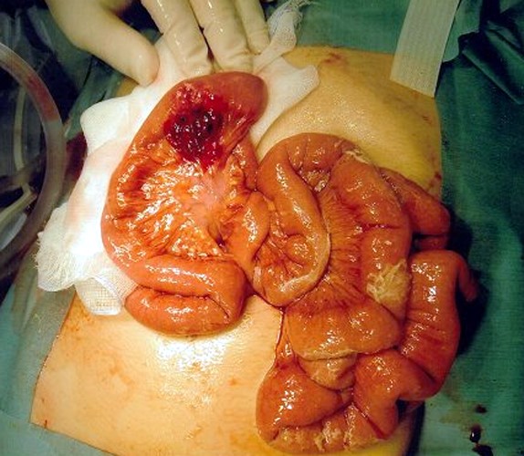 - 十二指腸水平部あるいは近位空腸の穿孔が疑われ,緊急開腹手術となった.