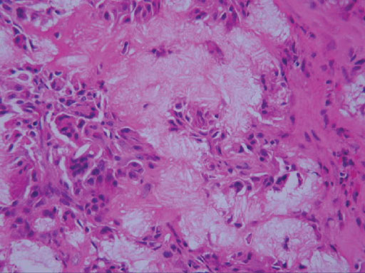 - 滑膜性骨軟骨腫症の術前診断で手術が行われ,腫瘤摘出と中頭蓋底骨の側頭筋弁による充填が行われた.病理組織学的には線維化,異物型巨細胞,類円形の組織球系細胞に加え,多数の角材?針状結晶がみられ,ピロリン酸カルシウムの結晶沈着症の所見であった.