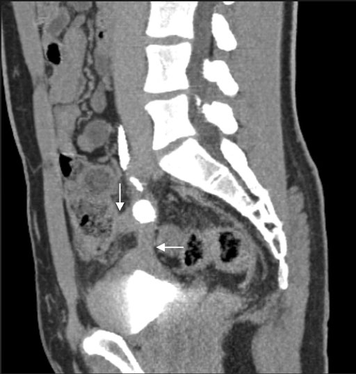 CT矢状断像で上行結腸から肥厚した膀胱頂部に連続する帯状構造物がみられ(矢印),内部に石灰化が認められる.