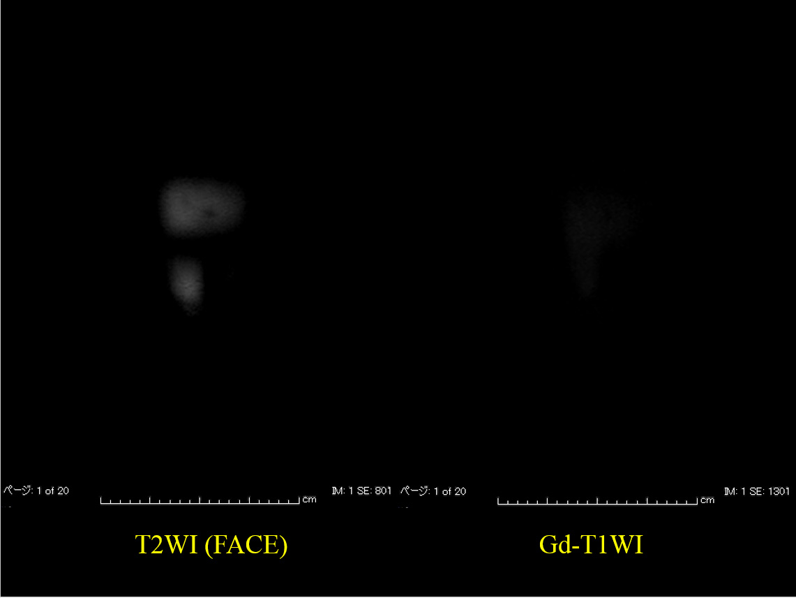 すなわちT2WI、T1WIでいずれも高進号を呈すが、脂肪抑制で抑制されず、造影で辺縁部のみわずかに濃染される。