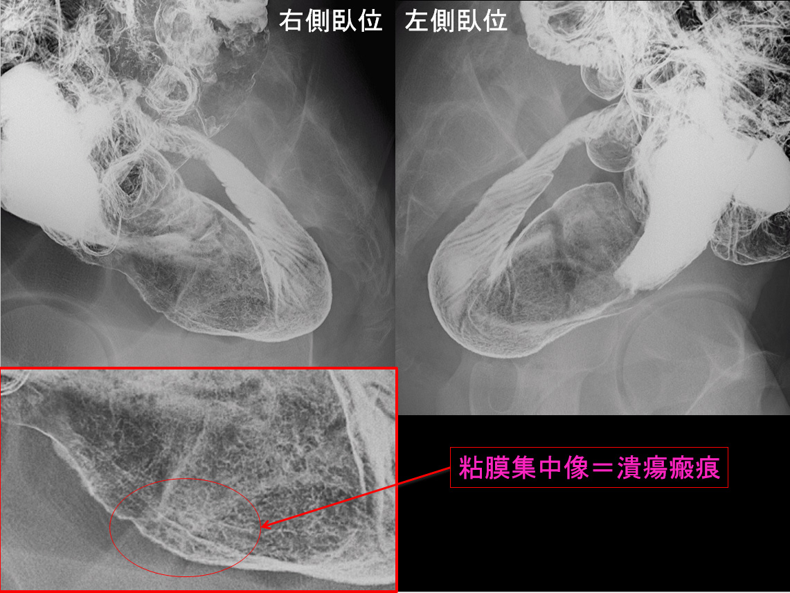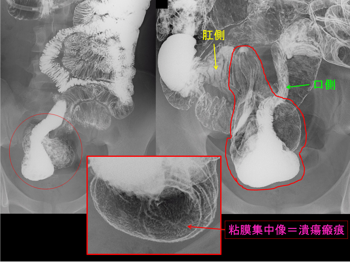 - 有管法による小腸造影にて、骨盤腔内の回腸に部分的な嚢状拡張が描出された。その粘膜面は萎縮性胃炎様であり、潰瘍瘢痕を疑う粘膜集中像も示現された。小腸造影は本症の診断に有用であった。