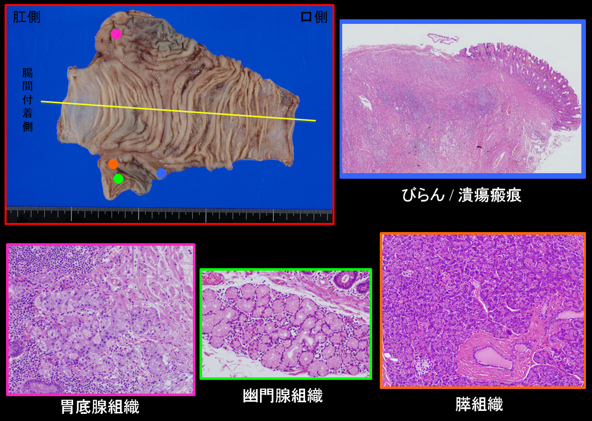 病理組織学的検索では、大きさが17x14cm大の回腸の部分拡張の形態をとり、同部には異所性胃粘膜の他、異所性膵粘膜も存在し、メッケル憩室の確定診断を得た。