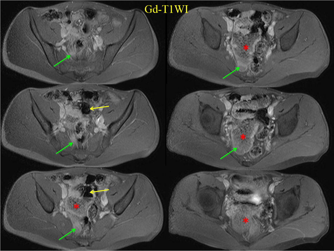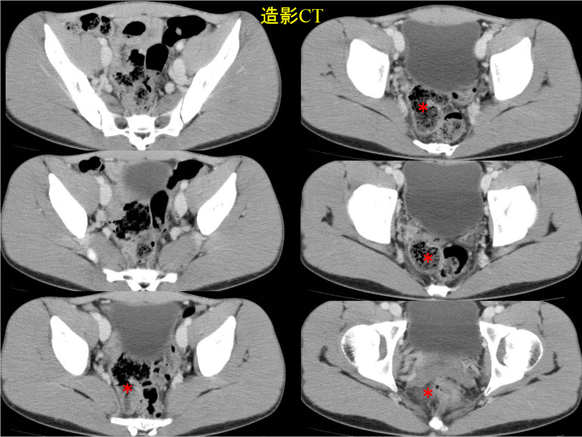 - CT水平断のみでは、一見して異常所見の指摘は困難(便塊の貯留した直腸との鑑別が困難)である。