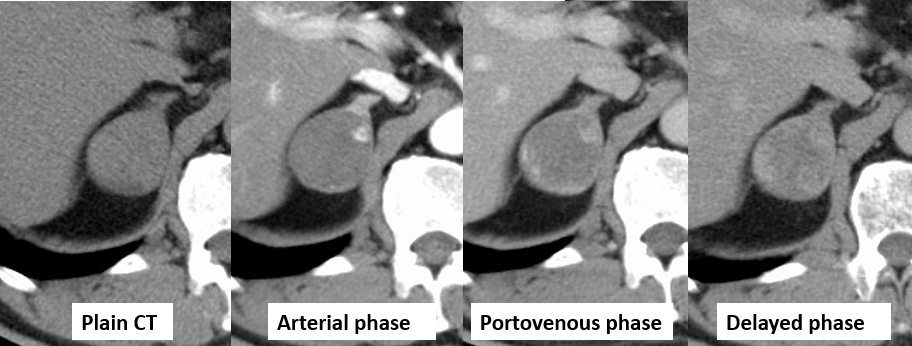 - 病変内部に出血、壊死、線維化を伴う場合、肝の海綿状血管腫のような腫瘍全体の濃染はみられないことが多い